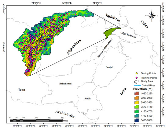 Chitral is located within 35°14′00″ N to 36°56′00″ N and 71°11′00″ E to 73°42′00″ E, with an area of 14,850 km2 [36]. Geographically, on the eastern side of Chitral, the Ghizer District of Gilgit Baltistan and the Swat District are situated. Afghanistan is on the northwest side of Chitral, and on the southern side, Upper Dir is situated. Khyber Pakhtunkhwa (KPK) is the northwestern province of Pakistan and Chitral is the biggest district in this province [21,37,38]. This city is also known as Chitral and Qashqai. Chitral is undoubtedly the most sentimental, dazzling, and captivating spot in the lofty Hindukush Range. Chitral is one of the most elevated areas of KPK Province. Chitral’s elevation sweeps from 1094 m at Arandu to 7726 m at Tirchmir. There are more than 40 peaks in Chitral. Tirchmir is the most noteworthy pinnacle of the Hindu Kush, with a height of 7708.08 m. The terrain of Chitral is hilly. Timberland covers nearly 4.8% of Chitral’s land and mountains.