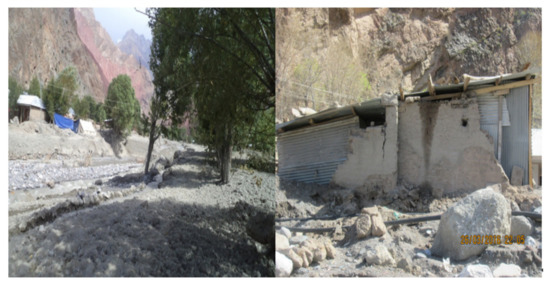 There have been sporadic disasters and emergencies in the last ten years due to flash floods, landslides, avalanches, and glacier lake outburst floods (GLOFs), resulting in the loss of human and animal lives, and partial or complete damage to infrastructure [28]. Pakistan is exposed to various hazards, including waterlogging, riverbank erosion, floods, cyclones, earthquakes, drought, desertification, landslides, heatwaves, GLOFs, and water salinity. Pakistan has experienced 25 calamities from 2000–2015 in which floods, earthquakes, and landslides were the most common [20,23,29,30,31,32]. During the last six years, there have been glacier outbursts in two major areas: upper Chitral Sonoghour and Booni. Recently, on 2 August 2013, unusually heavy rain in the upper pastures of Reshun village caused an unprecedented flash flood. Similarly, in July 2015, the heavy rainfall on the upper barren land of low altitude pasture above the village changed the rill into a heavy flash flood. Structures were destroyed, irrigation channels and linking roads were damaged, and gardens, crops, and orchards were washed away [2].