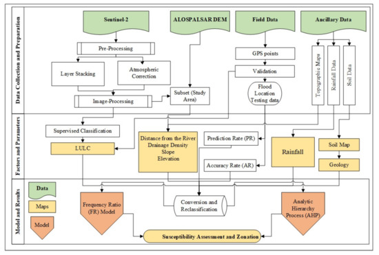 Flood disasters have become the most frequent natural phenomenon due to climate change and environmental factors. There is a significant threat to human lives worldwide because most countries are susceptible to flood hazards, and it causes different types of damage, such as physical, social, and economic damage. Floods cause damage everywhere, especially in agricultural areas and infrastructure sectors near rivers. This phenomenon may be due to no proper mapping or preventive measures or different parameters, such as the drainage density and slope. Floods occur due to several reasons. Heavy rainfall is one of the significant reasons behind floods. Floods are caused when it rains heavily and discharge exceeds the capacity of rivers, dams, and canals [1,2,3]. Flood risk modeling is an essential strategy for flood management and mitigation [4,5]. Furthermore, some human factors affect recurrent floods, among which are changes in land use, channel manipulation, construction of bridges, barrages, agriculture practices in river beds, and deforestation [6,7,8]. Therefore, initial measures should be taken to minimize flood hazard damage. Such susceptibility analysis needs to be done, and risk analysis should be performed as early as possible [9,10].