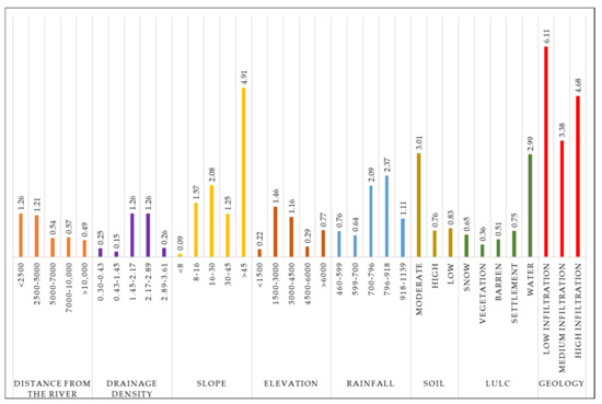 Flood susceptibility mapping is an approach for making plans and managing pre-hazards, which is needed to decrease the risk factors. Because of the high altitude, the region of Chitral is often called a flood-prone location. With some intervals and return dates, there are many signs of catastrophic flooding in this area. This study highlighted the analysis of flood vulnerability based on decision making approach, i.e., analytic hierarchy process and frequency ratio. Several independent causes induce/condition flooding and play essential roles in flood evaluation. Thus, a statistical databank was prepared for all eight selected conditioning factors (river distance, drainage density, slope, elevation, rainfall, soil, geology, and LULC) with the corresponding subclasses (Figure 5). Their spatial relations with flood risk were calculated precisely and are given below. Relationships between flood-susceptible and flood-inducing variables were made to make spatial comparisons between flood-susceptible regions and flood-inducing variables. In this respect, the values for class weight and factor weight were considered. A factor’s weight value shows the relative significance of each factor chosen for and determined using the AHP. The class’s weight value shows the importance based on each factor for every individual class and provides valuable details for understanding the role of flood generation.