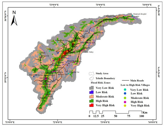 First, via an overlay analysis, final susceptibility zones were generated in GIS environments based on the values of the factor weights and the class values collected from the FR and AHP analyses. For the same variables, the SCWV of each subset of all chosen factors was used, as seen in Figure 5. The flood susceptibility index (FSI) was then determined by summing up the FR value for every flood-causing factor identified. A higher FSI value indicates a greater susceptibility to flooding events. Conversely, lower FSI values suggest less susceptibility to the occurrence of flooding. To recognize the Chitral District’s spatial flood risk zones, the FSI database was reclassified into five susceptibility zones. The output zones were categorized into very low, low, moderate, high, and very high risk, covering 7457.5, 1502.56, 2833.69, 1888.036, and 1168.11 km2, respectively (Figure 6 and Table 4). During the affected areas visits, some severely damaged villages were identified (Figure 6). Riverside areas of Madak, Booni, Resham, Owiran, Marot, Mario, PSO, Lot Deh, Ayun, and Singur were shown to be at high flood risk. Second, parts of the western side of Rich Gol, Torkhov, Nohbaiznoh Zom, Chapalli, and Last were identified as having low to extremely low susceptibility to flooding. The low to high susceptibility classes for flooding suggest that these regions were more susceptible to incidences of severe floods.