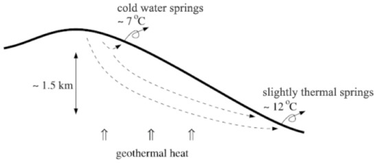 Conceptual diagram indicating flow path differences between shallow coldwater springs and slightly thermal springs from volcanic regions. Adapted from [29].