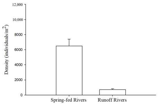 Comparison of invertebrate densities between three volcanic spring-fed rivers and three runoff rivers in northern California, USA. (Adapted from [15]).