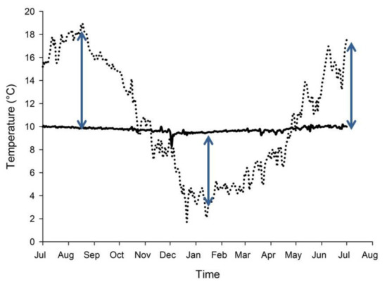 Comparison of thermal fluctuations on a volcanic spring-fed river (solid line) and runoff river (dotted line) in northern California, USA. Arrows indicate typically stressful periods for fish and other coldwater biota. (Adapted from [15]).