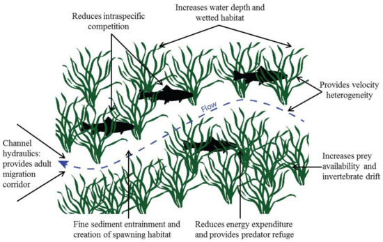 There are additional benefits to salmonids associated with macrophyte habitats. Structurally complex habitats in rivers, such as large wood, have been shown to increase the carrying capacity of stream-rearing salmonids and reduce intraspecific competition [133,134,135,136,137,138]. While the mechanisms behind these findings are not entirely clear, habitat complexity provides an important balance between resource availability, predator and velocity refuge, and visual isolation from conspecifics [139]. This latter effect has been deemed important in reducing physiological stress from aggressive interactions associated with dominance hierarchies, which can reduce growth rates and induce mortality [140]. Similar to more traditional forms of salmonid habitat, aquatic macrophytes may also provide similar benefits to salmonids. In a manipulative study, Eklov and Greenberg [59] found that the addition of artificial macrophytes to a stream significantly increased the density of juvenile salmonids when compared with barren reaches. The authors attributed their results to both increased refuge from terrestrial predators and visual isolation from congeners. We suggest that aquatic macrophytes confer benefits similar to more traditional salmonid habitat forms and positively affect salmonids in numerous ways [7,141] (Figure 6).