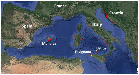 - Lo Presti, V.; Antonioli, F.; Palombo, M.R.; Agnesi, V.; Biolchi, S.; Calcagnile, L.; di Patti, C.; Donati, S.; Furlani, S.; Merizzi, J.; et al. Palaeogeographical Evolution of the Egadi Islands (Western Sicily, Italy). Implications for Late Pleistocene and Early Holocene Sea Crossings by Humans and Other Mammals in the Western Mediterranean. Earth. Sci. Rev. 2019, 194, 160–181. [Google Scholar] [CrossRef]