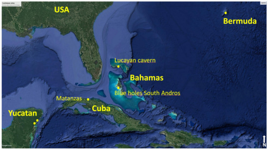 - Van Hengstum, P.J.; Richards, D.A.; Onac, B.P.; Dorale, J.A. Coastal Caves and Sinkholes. In Handbook of Sea-Level Research; John Wiley & Sons, Ltd.: Chichester, UK, 2015; pp. 83–103. [Google Scholar]