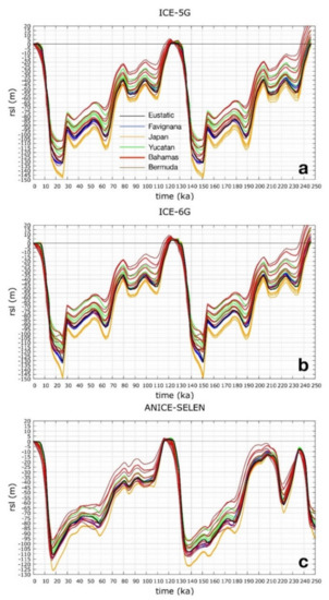 - ICE-6G [75]: This model is a modified version of ICE-5G. Here, we applied the same repetition as in the series of ICE-5G. According to the ICE-6G, the maximum MIS 5.5 eustatic highstand between 129 ka and 123 ka is ≈3.1 m above present-day msl as a consequence of reduced Greenland and West Antarctic Ice Sheets