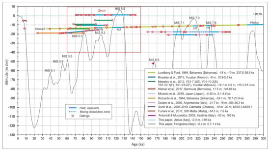 - Antonioli, F.; Bard, E.; Potter, E.K.; Silenzi, S.; Improta, S. 215-ka History of Sea-Level Oscillations from Marine and Continental Layers in Argentarola Cave Speleothems (Italy). Glob. Planet. Chang. 2004, 43, 57–78. [Google Scholar] [CrossRef]