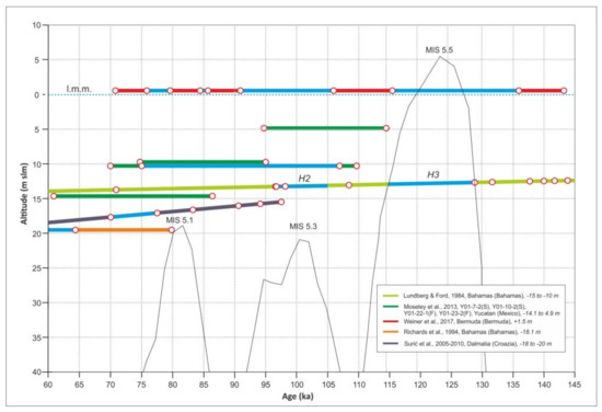 - Richards, D.A.; Smart, P.L.; Lawrence Edwards, R. Maximum Sea Levels for the Last Glacial Period from U-Series Ages of Submerged Speleothems. Nature 1994, 367, 357–360. [Google Scholar] [CrossRef]