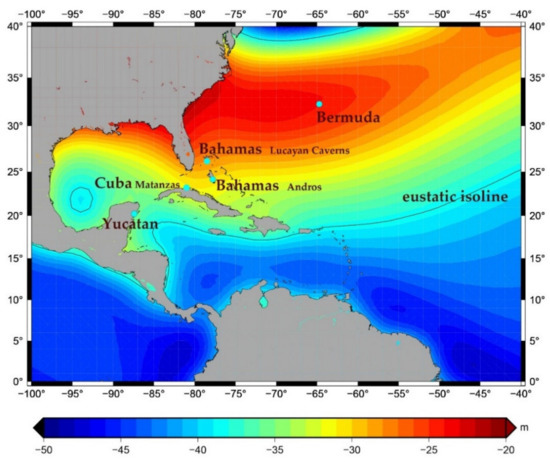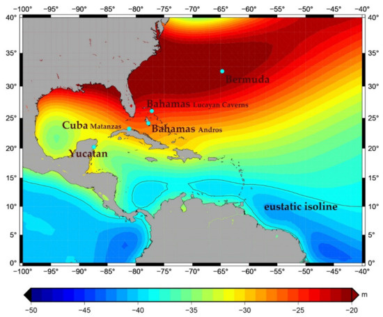 - Harmon, R.S.; Land, L.S.; Mitterer, R.M.; Garrett, P.; Schwarcz, H.P.; Larson, G.J. Bermuda Sea Level During the Last Interglacial. Nature 1981, 289, 481–483. [Google Scholar] [CrossRef]
