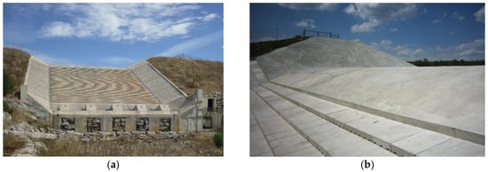 - Baker, R.; Gardiner, K. Construction and performance of a wedge block spillway at Brushes Clough reservoir. In Proceedings of the 8th Conference of the British Dam Society on Reservoir Safety and the Environment, Exeter, UK, 14–17 September 1994; pp. 214–223. [Google Scholar]