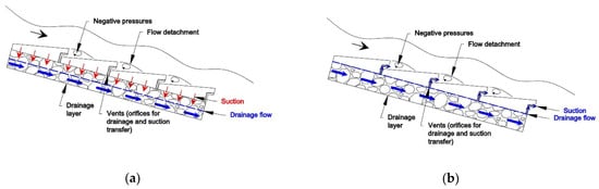 - Negative suction pressures were registered at the base of the two types of blocks when the drainage layer was not saturated. This is favorable for the stability of the block. The suction at the base was higher when the longitudinal joints between blocks were sealed. The effect of sealing just the upper part of the chute was remarkable. The leakage towards the drainage layer was significantly reduced, delaying or avoiding its saturation and, hence, the uplift force.