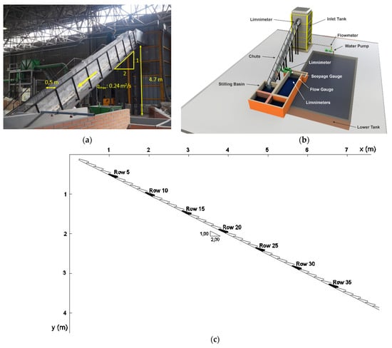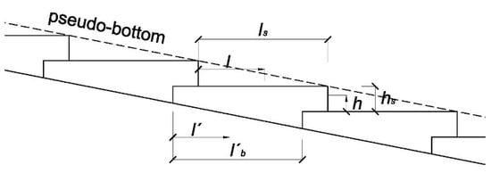 - Relvas, A.T.; Pinheiro, A.N. Velocity Distribution and Energy Dissipation along Stepped Chutes Lined with Wedge-Shaped Concrete Blocks. J. Hydraul. Eng. 2011, 137, 423–431. [Google Scholar] [CrossRef]