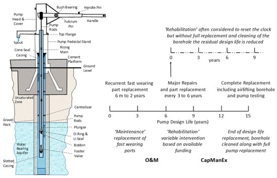 Capital maintenance expenditure (CapManEx) describes the costs of sustaining or renewing an existing service []. Whether routine maintenance includes CapManEx is a matter of the required frequency for replacement and cost []. Site-specific challenges (e.g., aggressive water chemistry that corrodes parts such as the pump stand and cement, or iron bacteria blooms reducing water flow in the borehole) result in variable CapManEx, which in turn will result in differences in site-specific costs between communities. CapManEx costs are therefore not widely understood by local and national governments and are not separated in budget planning [], and they should be the focus of the forensic analysis of all water points []. In addition, the complete replacement of pump infrastructure along with borehole rehabilitation (airlifting to remove sediment and possible treatments to chemically remove clogging agents) is extremely rare, even though it is a known requirement []. In most cases, NGOs and governments allocate rehabilitation budgets at the time of failure rather than planning for the CapManEx and budgeting for sustainability []. As a result, CapManEx is overlooked and under-resourced, resulting in failure of supply, abandonment, and reduced design life, producing stranded assets [,,,].