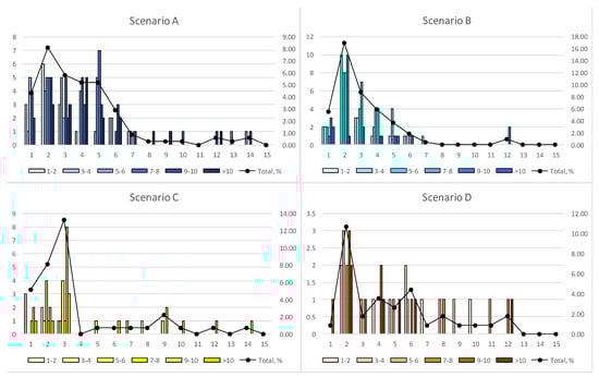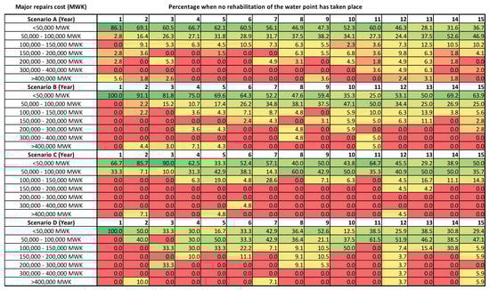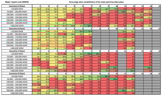 The costs expressed across the lifecycle are significantly higher for un-rehabilitated assets. Scenario A presents the largest distribution of cases of major repairs costing MWK >400,000, in the majority of cases between years 1 and 6. Scenario C also presents an increase in cases of MWK >400,000 in the first three years, where the majority of major repairs occur over the lifecycle. The major repairs conducted in Scenario B are primarily expressed between years 1 and 7. During this period, there is a higher distribution of costs expressed when compared to Scenarios A and C. However, these costs are significantly higher than those for assets without rehabilitation conducted (Figure 1). Scenario D follows a similar pattern to Scenario B, although to a lesser extent, as fewer major repairs and a lower cost distribution were evident.