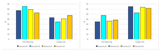 In all scenarios, assets with rehabilitation have a higher rate of replacement of longer-life components. Approximately two thirds of cases in Scenario A, with a regular monthly tariff, express a distribution toward longer-life components (65.3%). Scenario C with an annual tariff and Scenario D with no tariff present a similar distribution toward longer-life components (63.8% and 61.8%, respectively). Scenario B, providing a tariff only when repairs are required, presents a narrow distribution between the two types of components, with a weighting of 2.5% toward longer-life components.