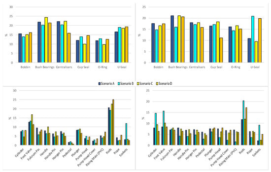 Of the fast-wearing components replaced when no rehabilitation has occurred, all scenarios follow a similar distribution for component replacement (Figure 5). The three most common components under the fast-wearing parts category are bush bearings, centralizers (where Scenario D presents a lower distribution compared to the other scenarios), and U-seals. Bobbins represent approximately 15% of fast-wearing components, while cup seals and O-rings represent between 10% and 15% of cases in all scenarios. Where assets have been rehabilitated, the majority of replacements follow a similar trend of between 15% and 20% of cases. Notably, there is an increase in O-ring replacements in all scenarios, an increase in cup-seal replacements concerning Scenarios A, B, and C (with a decrease in Scenario D), and a decrease in U-seal replacements (Scenarios A and C).