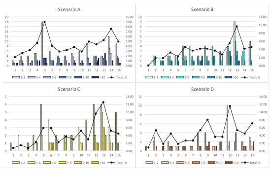 In Scenario A (after rehabilitation), the majority of replacements occur between years 1 and 5, with year 2 presenting the largest proportion of replacements (8.1%). This is followed by a steep decline before limited replacements toward the end of the lifecycle. Scenario B also expresses a peak in year 2 (17.0%) before a gradual decline in replacements between years 2 and 7. Scenario C presents an increase in the first three years of the lifecycle, reaching a peak in year 3 (13.3%). This is followed by a steep decline and minor replacements over the rest of the lifecycle. Scenario D shows the lowest number of replacements, with replacements mainly occurring in year 2 (10.7%), followed by a steep decline in year 3. There is then a consistent number of replacements up to year 12.