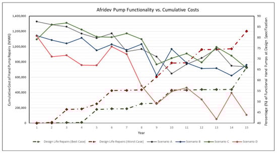 The recurrent design life and cost of each component can be used to determine the projected cumulative costs to keep the Afridev handpump fully operational. Figure 8 provides the routine (best case) cumulative costs for an Afridev over a 15-year period (MWK ~700,000), and projections based on the observed failure rate of parts in Malawi (worst-case cumulative costs) of MWK 1.2 million. The true functionality (ability to deliver water according to the design criteria of the Afridev) is a function of the operation of the pump, and a function of correct and professional drilling, testing, development, and installation of the borehole infrastructure. It is interesting to note in Kalin et al. (2019) [] that a significant proportion of Afridev installations do not provide water at design specifications due to poor or improper borehole infrastructure [,]; therefore, the statistical dataset on handpump functionality in Malawi can never approach 100% design functionality.