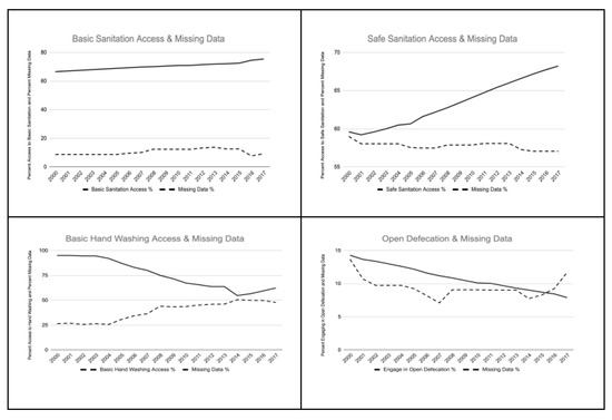 The new Sustainable Development Goals (SDGs), with a target date of 2030, identified even loftier goals—universal access for “safely managed” sanitation, with the JMP reporting progress through 2017 [14]. The most recent reports suggest that only about 45% of the global population have access to such safe sanitation [15]. While low, there are reasons to question this figure. Indeed, as Cumming and colleagues point out, most assessments of progress on water and sanitation targets compare community-level water with household sanitation. Once correcting for this, the authors assert that the global water deficit is as high as that of sanitation [8]. Further, with the change in targets from basic (improved) sanitation to safely managed sanitation, data availability has not improved to accurately assess progress. While the measure relied on for the MDG assessments (improved sanitation) is widely available temporally (1990–2017), the measure recording safely managed sanitation suffers from both high degrees of missing data and considerable bias regionally and in terms of development. We therefore question the extent to which findings concerning improvements in safely managed sanitation can be generalized.