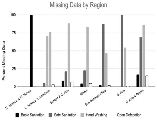 Beyond examining the proportion of missing observations yearly, however, it is important to determine the extent to which the missing data may be biased with respect to important characteristics related to sanitation access. For instance, prior literature has shown an association between sanitation access and income level [10,19,20,21,22]. Further, we know that certain regions of the world suffer from worse rates of sanitation than others. For these reasons, it is beneficial to examine whether the missing data are distributed evenly among the sample or if the missing data occur primarily in one geographic or development group. Figure 2 below examines missing data regionally, reporting the percent of missing data for four sanitation measures according to UN regional classifications.