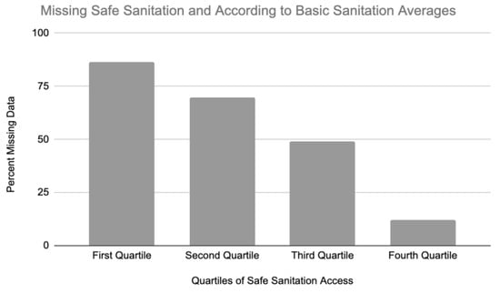 Examining the development-wealth nexus further, we investigate whether the connection between sanitation access and data quality is more systemic. Figure 4 reports the percentage of missing data for safe sanitation (the benchmark utilized in SDG goal six) according to rates of basic sanitation access, organized by quartiles. The results suggested by this figure are striking: There appears to be a direct correlation between sanitation context in a state and degree of missing data. For instance, states with the lowest 25% average of basic sanitation access report the highest percentage of missing data on the safely managed sanitation measure (86.4%). Alternatively, states in the highest quartile of basic sanitation access report the lowest rates of missing data on safely managed sanitation (11.93%). This suggests that beyond the general issue of missing data, data are missing in a manner that imparts significant bias on any assessment.