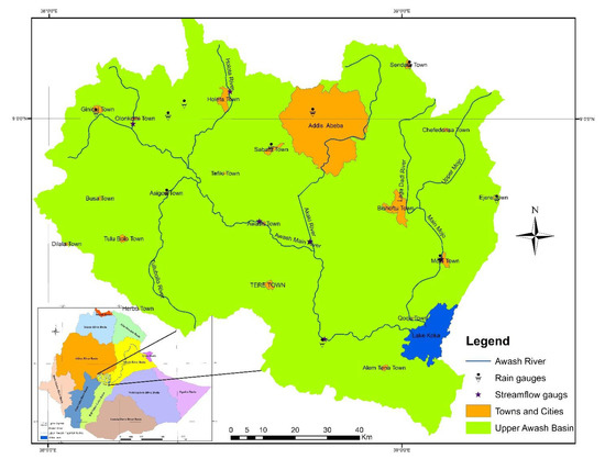 Scholars classify the Awash basin into three parts: upper basin, middle basin, and lower basin, according to its climatological, physical, socio-economic, agricultural, and water resource characteristics [11,25]. Upper Awash is a river basin that crosses the Ethiopian plateau to the central rift, and it covers 11,402 km2. This river flows from above 3000 to 1600 m a.m.s.l from its headwaters at Ginchi 75 km west of Addis Ababa to the Koka Lake. This basin is delaminated with the Abay River basin from the western side, the Omo-Gibe, Rift Valley Lakes Basin to the southwest, and the Wabe Shebele River basin to the southeast [26]. The basin extends from 38.52 to 53.23 longitude and 8.79 to 10.26 latitude, according to Figure 1.