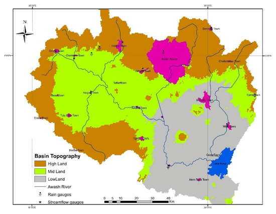Basin change of rainfall and temperature stations evaluation was within the elevation ranges from about 3400 to 1577 m a.m.s.l. Topographic classification of the study area revealed from DEM (Figure 2) with a spatial resolution of 12.5 m from Earth Data Alaska Land Facility https://earthdata.nasa.gov/ (accessed on 3 March 2019) using ArcGIS 10.3. This topographic variation has three systematical classifications, according to Figure 2. The first class is lowland, with elevation ranges from 1577 to 1990 m a.m.s.l; the midland class is elevated from 1990 to 2250 m a.m.s.l, and the highland area is the catchment elevated from 2250 to 3400 m a.m.s.l. The basin’s topographic formation is described, and accordingly, the basin’s temporal data analyses for the hydroclimate trend evaluation are carried out (Section 4).