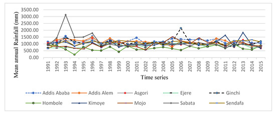 The precipitation data from eleven selected stations for the 1991 to 2015 time series (Figure 3) were used to evaluate the meteorological trend. The basin had 1019 mm mean annual rainfall. It had 1340 mm maximum and 873 mm minimum rainfall by 1993 and 1997, respectively. Arfaasaa, Ganna, and Birraa use agricultural time, and these are seasons considered to encompass basin’s most essential time. Therefore, seasonal and annual hydroclimate trend evaluation with respect to basin topography nature must be emphasized.
