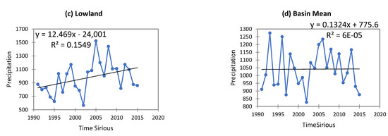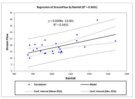 The linear regression method was applied to understand the correlation and rainfall influence over streamflow within the basin (Figure 7). The change in the rainfall resulted in a shift of the streamflow except for the mean annual streamflow of 1996. Accordingly, change in the rainfall and streamflow of the basin was observed, and the rainfall and streamflow of the basin variated respectively by 11.38 and 38.19% annually. The existing climate change could be one of the possible causes of such hydrologic variability of the basin.