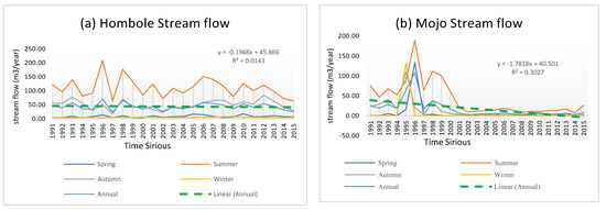 The Mojo river sub-basin displayed a decreasing trend of streamflow except for the Ganna season. The Awash-Hombole sub-basin displayed a decreasing trend annually except for the Berga and Melka Kunture streamflows. During Ganna season, Awash Balo, Berga, and Melka Kunture exhibited an increasing trend while the rest decreased.