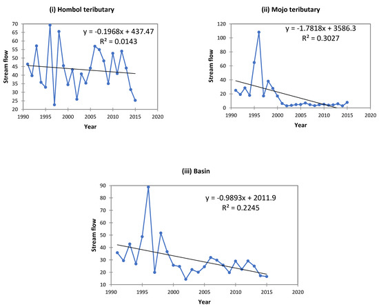 From the statistical analysis of the basin during the study time, Hombole and Mojo stations decreased (Figure 6i,ii).