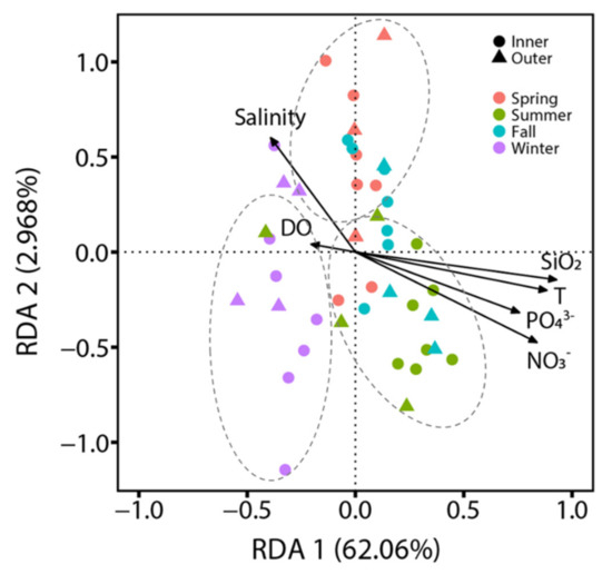 Redundancy analysis (RDA) presenting the relationship between the phytoplankton community and environmental variables during the sampling periods in the inner and outer bays of Gwangyang Bay. Abbreviations are as follows: DO = dissolved oxygen, T = temperature.