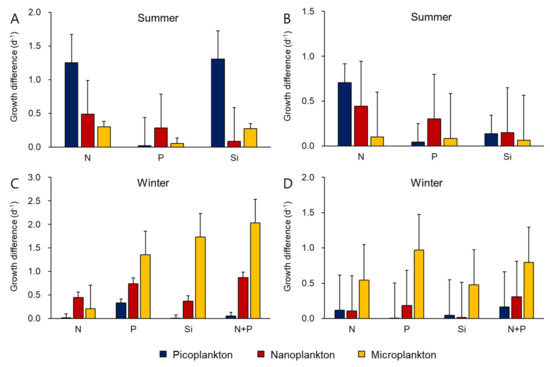 Growth differences (d−1) of size-fractionated phytoplankton in response to nitrate, phosphate, silicate, and a combination of nitrate and phosphate. (A) Growth differences in the inner bay in the summer, (B) growth differences in the outer bay in the summer, (C) growth differences in the inner bay in the winter, and (D) growth differences in the outer bay in the winter. Abbreviations are as follows: N = nitrate, P = phosphate, Si = silicate, and N + P = the combination of nitrate and phosphate.