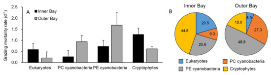 The dilution experiments elucidated the grazing mortality rates (d−1) of the major phytoplankton groups, including eukaryotes, PC cyanobacteria, PE cyanobacteria, and cryptophytes. In the inner bay, cryptophytes had the highest grazing mortality rates (1.3 d−1), whereas, in the outer bay, both types of cyanobacteria had the highest grazing mortality rates (0.9 d−1 for PC cyanobacteria and 1.7 d−1 for PE cyanobacteria; Figure 8). Furthermore, the grazing mortality rates of eukaryotes were relatively low (0.6 d−1 in the inner bay and 0.2 d−1 in the outer bay) compared to those of the other groups (Figure 8).