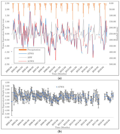 (a) Monthly precipitation and in TWSC, GWSC, and, SWC in the TMB and (b) GRACE data uncertainty band.