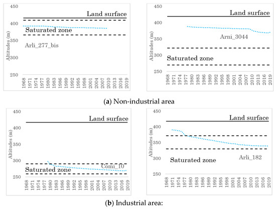 For an overview of the drawdown since the beginning of mining activities (1968 to 2019), the evolution of the water table from a few representative piezometers of the whole area is presented by the hydrographs of Figure 7.