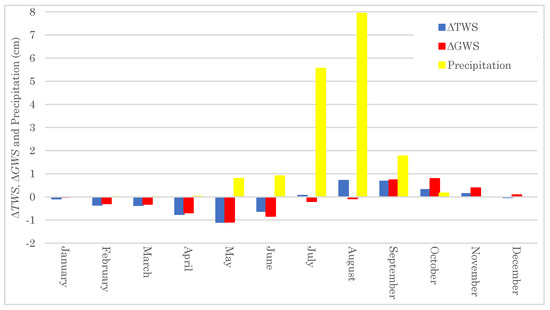 Annual distributions of water storage variations in terms of equivalent water thickness (cm) and precipitation (cm) on the TMB by the means of monthly averages from August 2002 to December 2019.