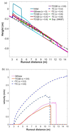 Additionally, from Figure 2a, a significant difference is observed in the results produced by QDnew and TCQD. Even though they both had the same initial geometry failure, the runout distance of debris for TCQD was lesser than that of QDnew. This was due to the presence of the bed deformation equation, whereby sediments in TCQD can be deposited since the bed was assumed to be only depositional, compared to QDnew, where the materials could not get deposited or eroded due to the lack of bed deformation equation. However, the flow tail still maintained its height with that of QDnew based on the influence of the critical height.