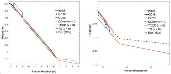 The models (TC, QDnew, and TCQD) were further tested against experimental data from Mohrig et al. [35] (case M2a and M3a). For this study, a tentative concentration of 0.4 was used for the TCQD and TC models. We also set the cross-sectional velocity of the models to be zero, thereby making the three models one-dimensional. Since the initial failure geometry of the setup by Mohrig et al. [35] was unknown, except for the initial volume of 30 L for the debris, this study decided to use an initial rectangular geometry of length 1.5 m and height 0.09 m for model calibration. Since the bed used in the experiment was hard, the beds were also set to be fixed in TC and TCQD and the flow was only depositional.
