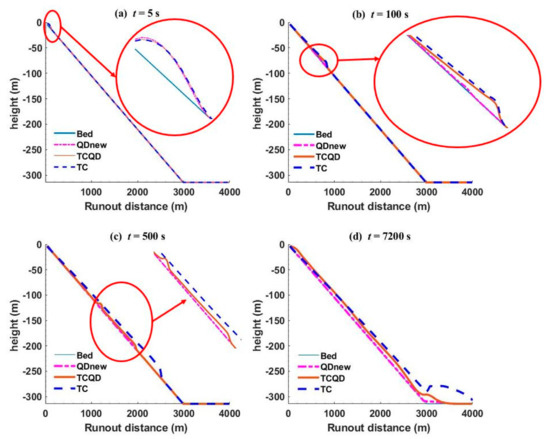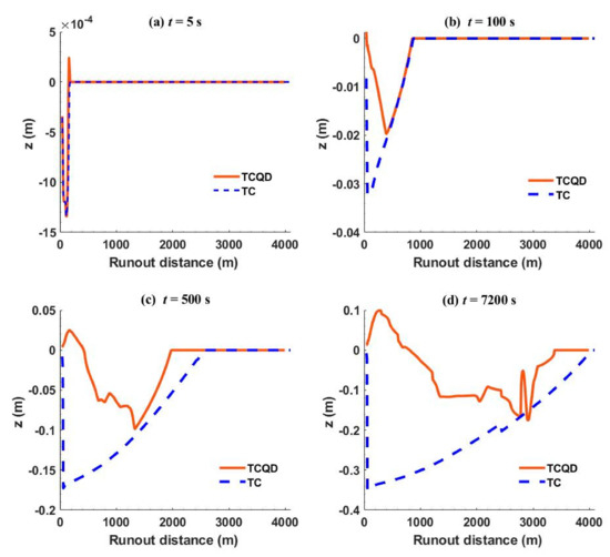 Finally, the bed profiles of TC and TCQD for different times are shown in Figure 9a–d. This signified the importance of the bed deformation equation in TC and TCQD, which was lacking in QDnew. The scoured depths at 5 s (Figure 9a) were similar since the flow had just started, with very minimal bed changes. However, there was a considerable difference as the flow progressed. At 100 s of the flow (Figure 9b), both models experienced significant erosion, even though erosion was more rampant in TC than TCQD. The erosion pattern of TC looked regular, as the greatest erosion occurred at the flow tail, while that of TCQD was irregular, whereby the erosion was strongest at the flow front with a haggard pattern. As the flow approached 7200 s (Figure 9d), there was considerable deposition at the flow tail of the debris flow for TCQD compared to the flow tail at 500 s, which indicated that the debris was getting fully deposited due to loss of momentum as it approached the flat bed. Additionally, both erosions in the models TC and TCQD at this time experienced a decrease in erosion and more deposition since the bed was getting gentle. The erosion phenomenon is one of the dangers associated with debris flow, which can lead to the exposure of materials on the sea bed and as well their destruction. Therefore, our observations stressed the importance of the bed deformation equation in the modeling of debris flows, and this study reasonably proved that a debris flow can be erosional and depositional.