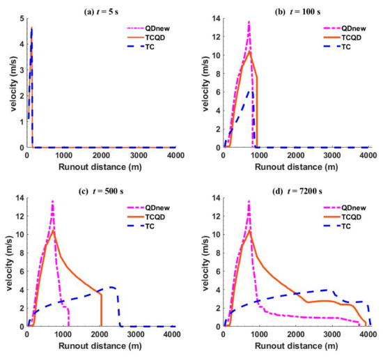 The velocity profiles for the three models at different times are shown in Figure 7a–d. From Figure 7a, the three models experienced a sharp increase in velocity to about 4.5 m/s due to the influence of gravity causing a crashing of the debris. This could explain the same runout distance experienced at 5 s. However, at time 100 s (Figure 7b), the debris models QDnew and TCQD still had a significant increase in their velocity, respective to about 14 m/s and 10 m/s, while the turbidity current flow had an insignificant increase despite having a longer runout distance as TCQD. The lower velocity of the TCQD and TC models compared to the QDnew model could be as a result of more materials being transported by them as a result of the interaction with the bed leading to more resistance to flow, but a sustained flow. As the flow progressed at 500 s (Figure 7c), there was a sharp decrease in the velocity of QDnew and TCQD since the debris was getting settled and the shear resistance was getting higher, while TC still experienced a slight increase. The decrease by QDnew was sharper since it had less material than TCQD and could only support consistency in flow as long as materials were available for transport. Finally, at 7200 s (Figure 7d), the debris models already lost most of their momentum and were slowing down. Since TCQD carried more materials due to the bed interaction ability, the velocity was quite higher than that of QDnew with no bed interaction ability. TC, on the other hand, was also experiencing a gradual drop in velocity since there was a slope break, though not as sharp as the debris models, and thereby allowing further spreading of sediments on the bed (Figure 7d) compared to the debris models where their deposition was vertically oriented, that is, an increase in deposit thickness.