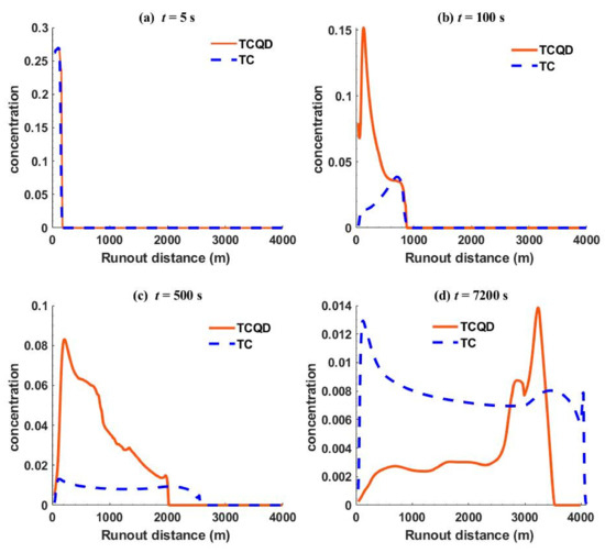 The concentration profiles by TC and TCQD at different times are shown in Figure 8a–d. At the start of flow when the time was 5 s, the debris was just experiencing a crash and the spreading or differences were not significant enough. However, at 100 s and 500 s (Figure 8b,c), the sediments spread farther downslope, even though the spreading was more prevalent in TC than TCQD, since the rheology of TCQD facilitated higher shear resistance than TC with a lower shear resistance. Finally, at 7200 s (Figure 8d), the sediments were deposited and the higher concentration for TCQD was seen at the slope break, which could have been a result of the stoppage of flow confirming vertically oriented deposition, while TC had sediments spreading as the flow progressed along the deposition bed, indicating horizontally oriented deposition.