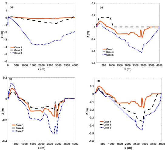 Figure 10a shows the result of the different sediment sizes of 37 µm, 50 µm, and 100 µm, representing cases 1–3. The findings showed that the bed sediment sizes had a strong influence on the erosion and deformation of the bed. The bed with the highest sediment size, that is, case 3, which was made of coarse particles (100 µm), had the highest scoured depth compared to finer sediment size (37 µm, case 1), which had the least scoured depth. This could be a result of the high-speed condition that defines the value of the erosion coefficient. When the speed of the debris was high, the erosion coefficient can be insensitive to the sediment size and the coefficient would be determined by the speed of the flow (Equations (11) and (12)). On the other hand, the net sediment change flux (Equation (10)) was directly influenced by the sediment size. Therefore, the flow with higher particle size was more entrained, which may even lead to more erosion of sediment than the entrainment by water. According to Gauer and Issler [47], the erosion speed increases with an increase in particle size. Davies and McSaveney [48] recommended that smaller particle sizes of bed sediments should not be used for erodible beds in experimental investigations as the materials become too fine, leading to a high basal resistance that prevents entrainment and could even generate great dust instead. Additionally, Iverson et al. [49] explained that large cohesion (finer sediments) of sediment beds could lead to higher shear resistance, which causes lesser erosion. Therefore, larger bed particles should be used to study the entrainment property of a flow. From this particular observation, the size of sediment plays a very important role in how much the bed is affected during a debris flow.