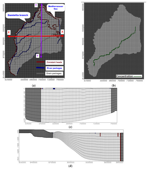 The ENDA has three types of boundary conditions. The first boundary condition is the constant head which represents sea level with a value of zero; the second boundary condition is the river boundary which represents the main water bodies of the main system of canals; the third boundary condition is the drain boundary which represents the main system of drains (presented in Table 1). Figure 2a shows the head boundary condition for the ENDA domain. The concentration with constant ranges from 4971 to 5010 mg/L is assigned along the Bahr El Baqar drain length, as presented in Figure 2b.