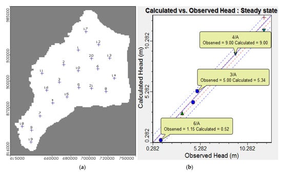 Calibration of the model for (a) a real view and (b) calculated versus observed heads.