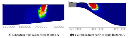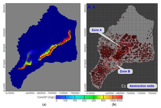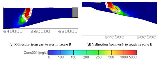 The MT3D model is used to investigate the solute transport to the groundwater aquifer. The model results indicate that the contamination moves in the same direction as the groundwater flow. Figure 5a presents an area view of the contaminant, with total dissolved salt (TDS) in the ENDA for isochlorine 1000 ppm at Layer 4 located between 80 and 200 m below the ground surface. The simulated TDS source in and sink out in the ENDA with a total salt mass of 6.907 × 1010. Two cross-sections in the model domain are presented to investigate the impact of over pumping on the groundwater quality in the study area. The first cross-section is located in zone A which has a large number of wells with high abstraction rates, while the second cross-section is located in zone B which has a low number of wells with low abstraction rates, as presented in Figure 5b. Figure 6 presents the contaminant extension for isochlorine 1000 ppm in the X and Y directions of zone A. The results show a clear extension of contaminant into the study domain, while the results presented in zone B show a sharp impact from the drain in the aquifer.