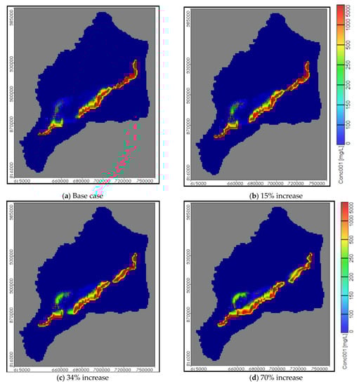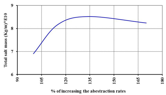 The data presented in Table 3 show the expected abstraction rates and the calculated TDS values for the proposed scenarios. Figure 12 presents the relation between changing the abstraction rate and the total salt mass in the ENDA; the figure shows that changing the abstraction rates by 15% and 34% had a negative impact on total aquifer salt and distribution of TDS in the ENDA, while increasing abstraction by 70% led to a positive impact on the total aquifer salts due to the abstraction of salt from the aquifer. The salinity increased from 6.907 × 1010 kg in the base case to 8.165 × 1010 and 8.519 × 1010 kg in the first and second scenario, with a decrease to 8.239 × 1010 kg due to the effect of over pumping on abstraction the salt.