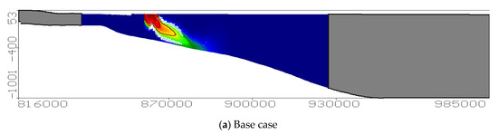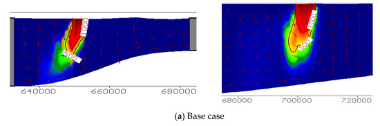 In the third case, the drain was lined using manufactured textured LDPE geomembrane which had a permeability of 0.0001 m/day. The results indicated a significant decrease in the total salt mass, reaching 3.969 × 109 as compared with 6.907 × 1010 in the base case. In the fourth case, the drain was lined using concrete with a permeability of 4 × 10−9 m/day; the results revealed that the concrete lining had a high positive impact on reducing the contaminant into the ENDA where the total salt mass decreased to 3.440 × 109. Figure 9 shows the results for the different lining materials on the contaminant extension in the X direction and Figure 10 presents the values in the Y direction. The results showed that the lining materials were useful for reducing the extension of contaminant and had a significant effect on groundwater quality.